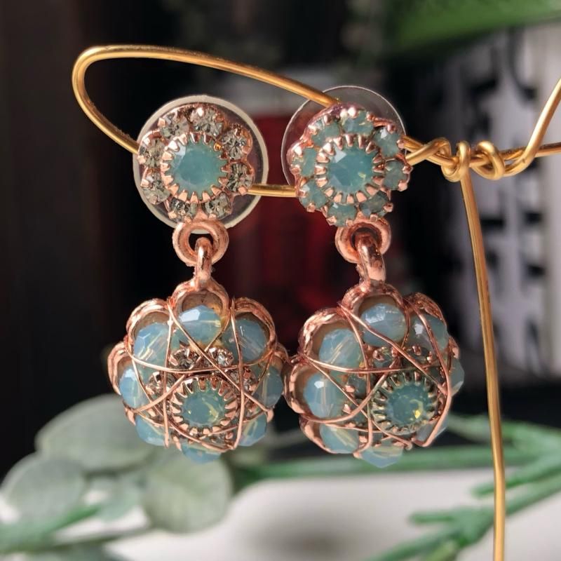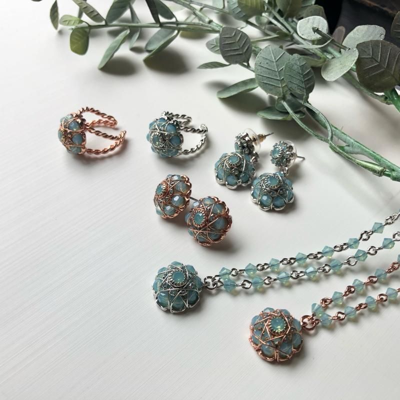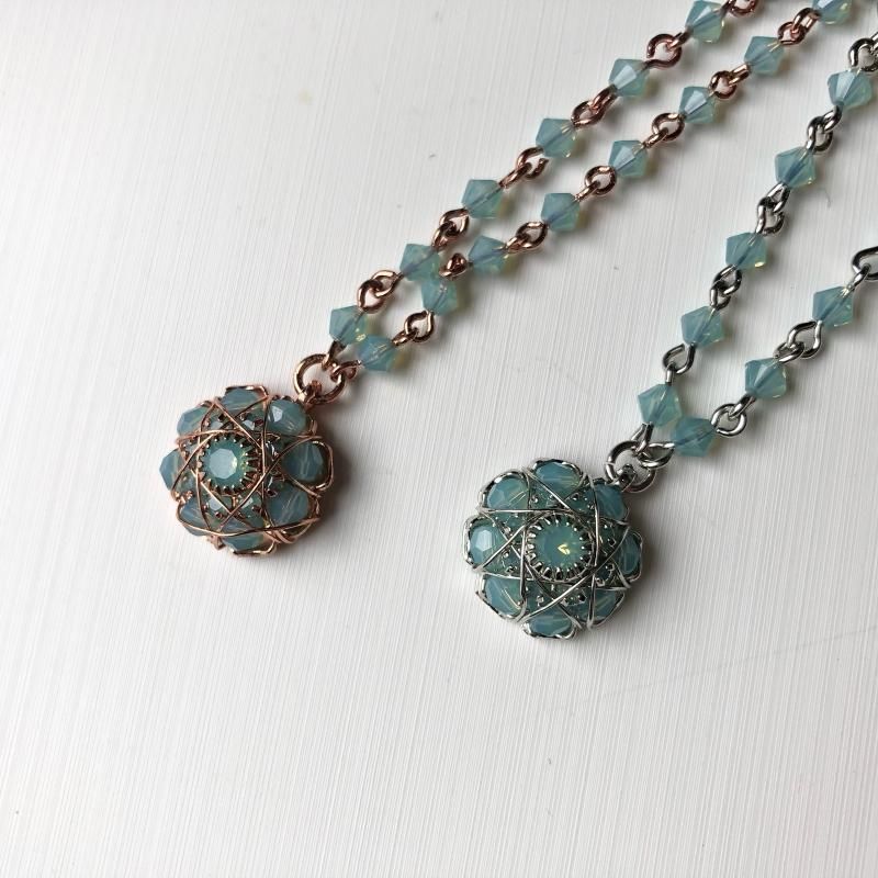 以前入荷したものは、小さなラインストーンがライトアゾレという透明感のある水色でしたが、今回は全てパシフィックオパールでできています。
