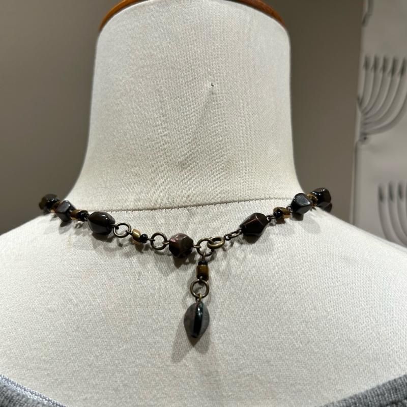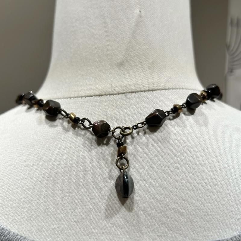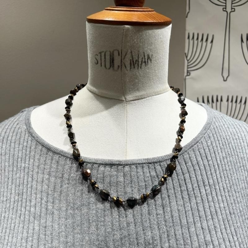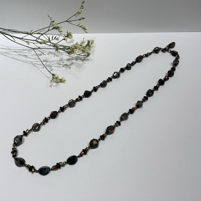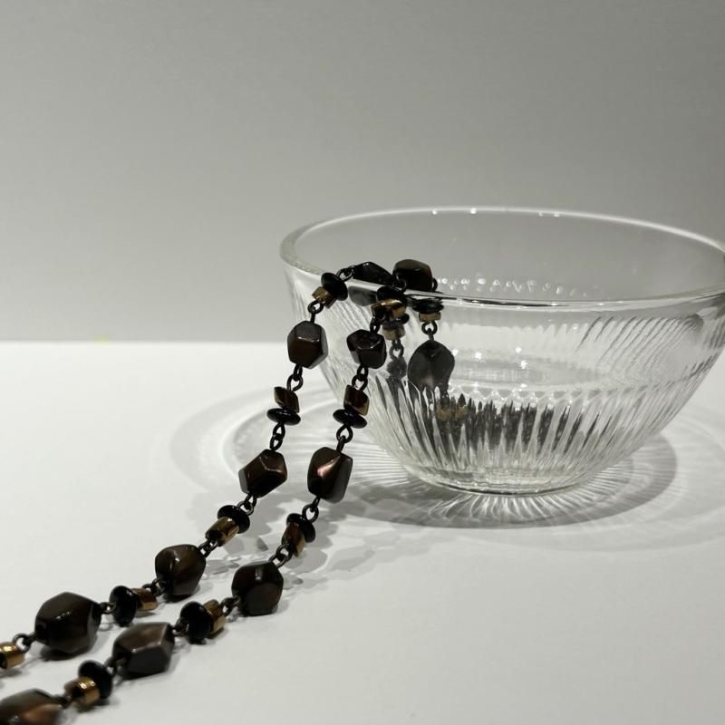 ランダムなフォルムのブラウンのガラスビーズに、ブロンズカラーとブラックの小さなガラスビーズが順に連なるデザインです。小ぶりですが、ひとつひとつのビーズはとても個性的。落ち着いた色合いには深みがあり、天然石のような深いブラウンカラーは秋冬の季節にピッタリです。また、メタリックなブロンズは贅沢な光沢感を纏い、華やかさを演出してくれます。
