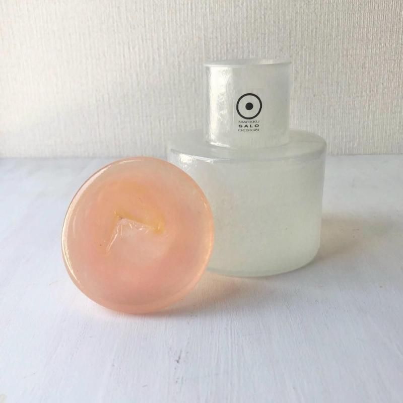淡いオフホワイトのボディにアプリコットカラーのほんのりオレンジがかったピンク色の蓋の組み合わせがとても愛らしいです。しっかりとしたピンクと比べると、オレンジが目立ちます。蓋は半透明で表面にイエローカラーがふんわりと乗った感じです。
